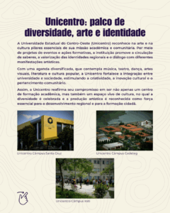 Assim, a Unicentro reafirma seu compromisso em ser não apenas um centro de formação acadêmica, mas também um espaço vivo de cultura, no qual a diversidade é celebrada e a produção artística é reconhecida como força essencial para o desenvolvimento regional e para a formação cidadã.