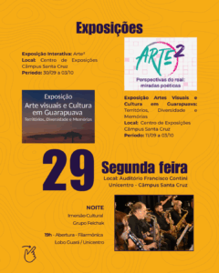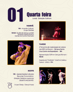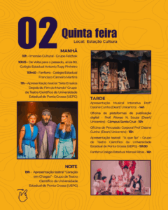 Para o Paraná faz Ciência, a Diretoria de Cultura da Unicentro preparou uma programação repleta de muita Arte e Cultura com apresentações de dança, música e teatro, exposições de artes visuais e oficinas. Confira: