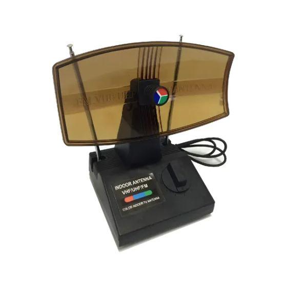 Seu design inclui hastes telescópicas para VHF e uma base circular para UHF, com conector padrão e cabo coaxial. É amplamente usada em residências e instituições com sinal moderado, representando uma solução acessível e prática para recepção multimídia.