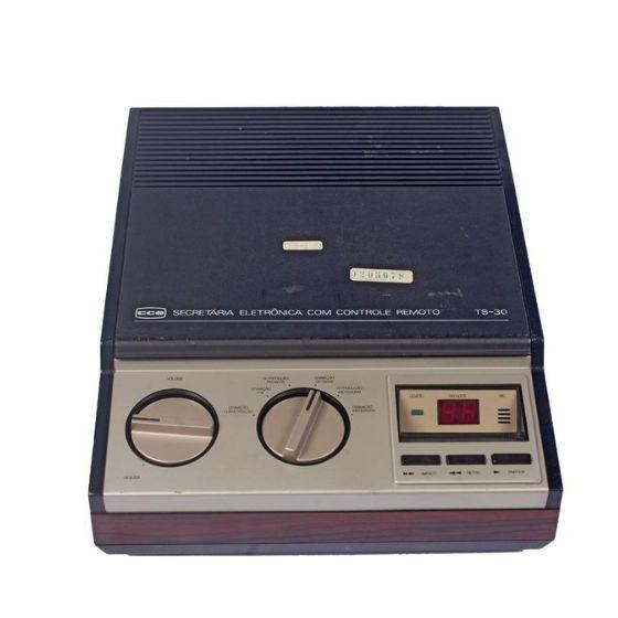 Este aparelho foi usado para gravar mensagens telefônicas quando ninguém podia atender. A CCE TS-30 conta com controle remoto, permitindo ouvir e gravar recados à distância. Possui entrada para fone de ouvido, visor de recados, ajuste de volume e seletor de voltagem (110/220 V). Fabricada na Zona Franca de Manaus, é um exemplo da tecnologia nacional acessível nos anos 80.