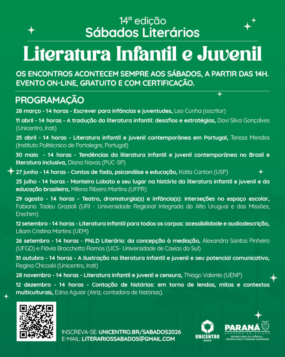 Com uma produção vasta e essencial para a formação de novos leitores, a literatura infantil e juvenil será tema dos “Sábados Literários” deste ano. Liderado pelo Departamento de Letras do Câmpus de Irati (Delet/I) da Universidade Estadual do Centro-Oeste (Unicentro), o projeto de extensão chega à sua 14ª edição com estreia marcada para o dia 28 de março. O convidado para a abertura será o premiado escritor Leo Cunha, autor de mais de 80 livros, entre literatura infantil e juvenil, crônicas e poesia.