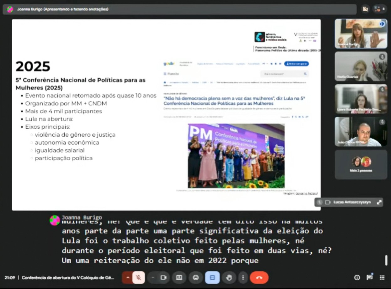 A abertura do evento contou com a conferência “Feminismo em rede: panorama político da última década”, ministrada pela professora, escritora e ativista Joanna Burigo. Em sua palestra, transmitida pelo YouTube, ela destacou as articulações feministas a partir de 2015, quando mobilizações iniciadas no ambiente digital passaram a ganhar as ruas.