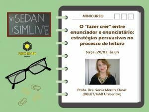 “Considerando os preceitos da teoria Semiótica Greimasiana, este minicurso objetiva discutir as projeções da enunciação no enunciado, escolhas feitas pelo enunciador, com vistas a persuadir o enunciatário. A partir de um exercício de leitura, serão retomados os recursos de debreagem, quando enunciador projeta no enunciado as categorias de pessoa, tempo e espaço, recursos os quais podem apontar para os sentidos de enuncividade, de distanciamento da enunciação, ou subjetividade, quando o enunciador projeta o eu, aqui e agora, produzindo um discurso enunciativo. É nas projeções da enunciação que se estabelecem as relações persuasivas entre enunciador e enunciatário, num jogo de fazer crer, passível de ser recuperado pela linguagem, pela organização de percursos figurativos e temáticos postos em evidência no texto.”