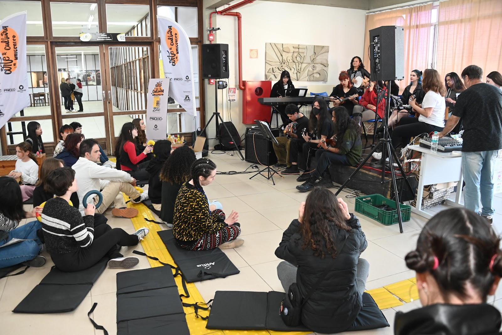 Nesta segunda-feira (14), alunos do curso de Arte da universidade realizaram uma roda musical interativa no hall do auditório Francisco Contini. no Câmpus Santa Cruz. A atividade teve como objetivo compartilhar com a comunidade, acadêmica e externa, os aprendizados das disciplinas de música, promovendo uma vivência prática com participação do público.