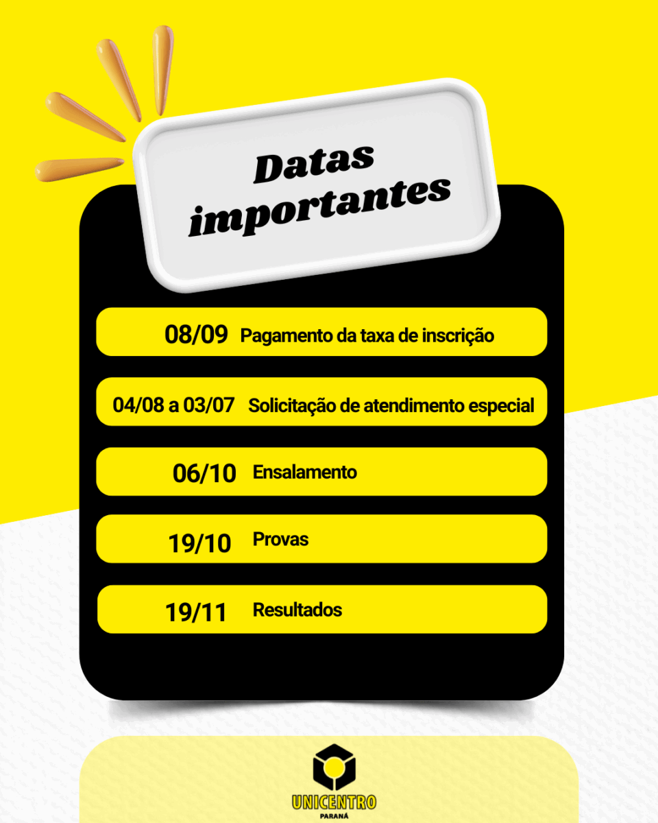 A Universidade Estadual do Centro-Oeste (Unicentro) inicia, nesta segunda-feira (4), o período de inscrições para o Vestibular 2026. Os interessados podem se inscrever até o dia 3 de setembro, exclusivamente pela internet. O valor da taxa de inscrição é de R$ 180.