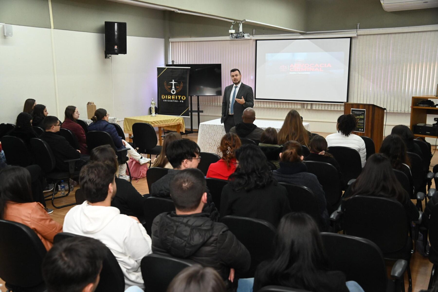 Em comemoração ao Dia do Advogado, celebrado em 11 de agosto, o curso de Direito da Universidade Estadual do Centro-Oeste (Unicentro) promoveu, nesta terça-feira (12), a palestra “Desafios e Oportunidades da Advocacia Criminal”, ministrada pelo professor e advogado criminalista Dr. Rudy Heitor Rosas. O evento reuniu acadêmicos do curso no miniauditório Prof. Ariel José Pires, no câmpus Santa Cruz, para discutir aspectos técnicos e práticos da atuação na área penal.
