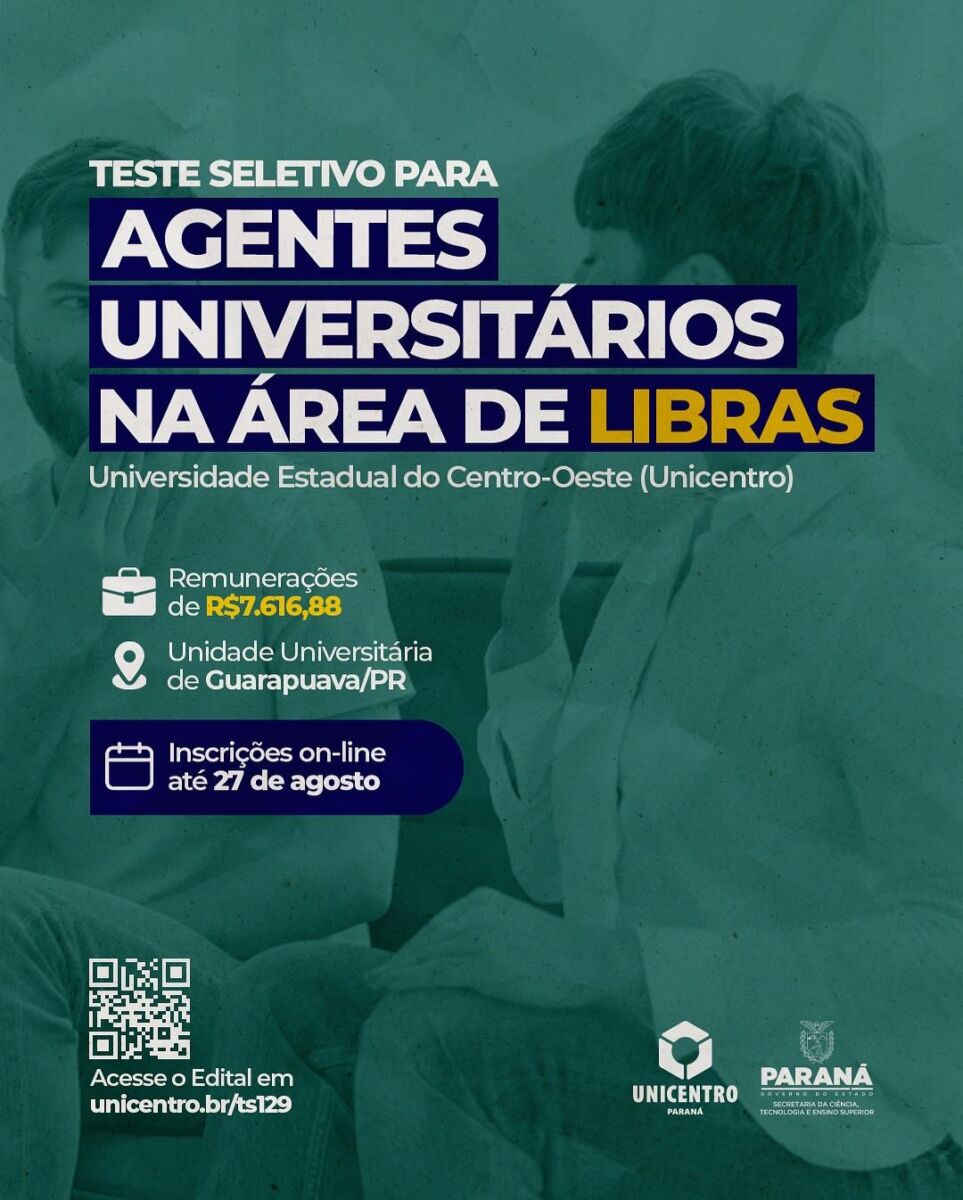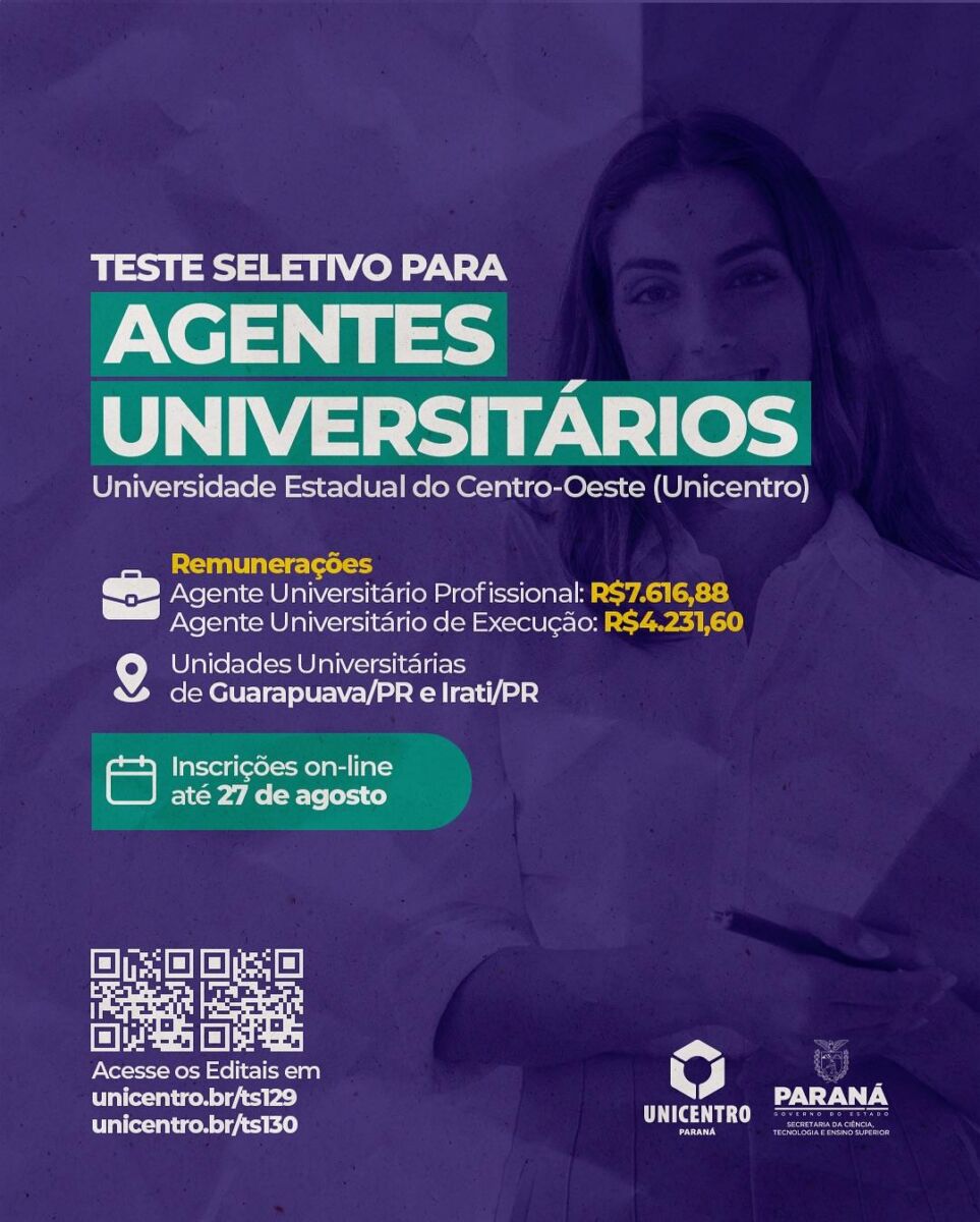 A Universidade Estadual do Centro-Oeste (Unicentro) tornou pública a realização do teste seletivo para admissão de Agentes Universitários Profissionais e Agentes Universitários de Execução, por meio dos Editais 129/2025 e 130/2025.