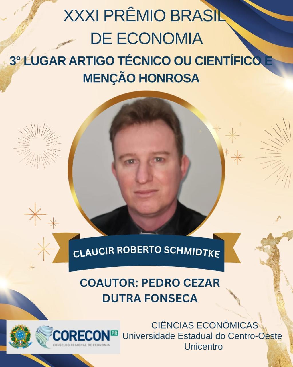 O docente Claucir Roberto Schmidtke, do Departamento de Ciências Econômicas da Universidade Estadual do Centro-Oeste (Unicentro), conquistou o 3º lugar e recebeu menção honrosa na categoria “Artigo técnico ou científico” do 31º Prêmio Brasil de Economia, divulgado pelo Conselho Federal de Economia (Cofecon) na última semana. Considerado um dos mais importantes reconhecimentos da área, o Prêmio Brasil de Economia é promovido anualmente e valoriza trabalhos técnicos e científicos que contribuem para o desenvolvimento econômico do país.
