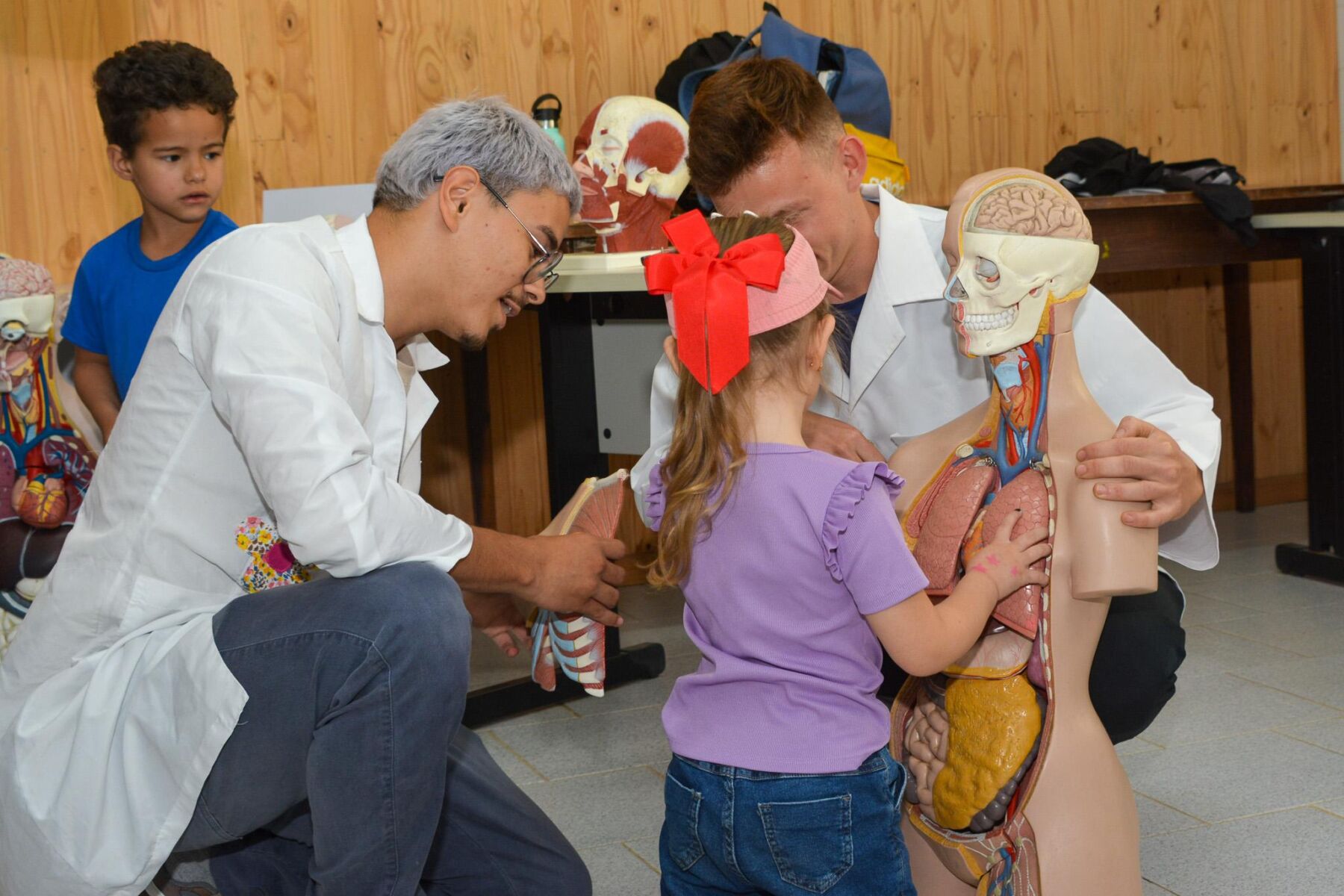 Em um modelo de feira de ciências, os pequenos circulavam por “estações”, nas quais os diferentes materiais do laboratório eram utilizados para explicar como funcionam os rins ou quais eram os ossos, por exemplo. A empolgação foi grande entre os visitantes. “Eu gostei do esqueleto”, conta Heitor. “Achei bem legal o pé e também a cabeça”, reforça Alice. “Gostei de brincar e do coração”, complementa Lorena.