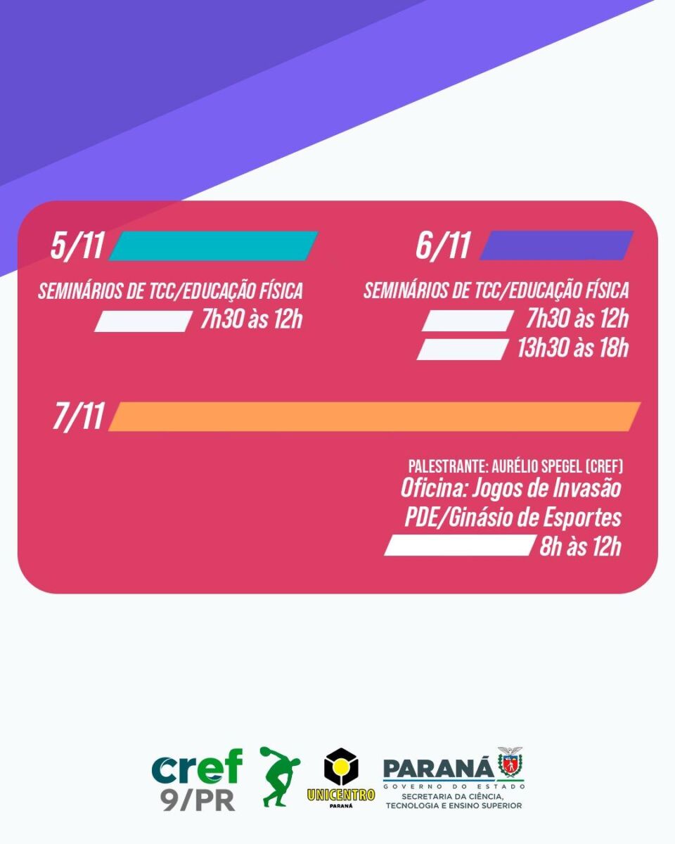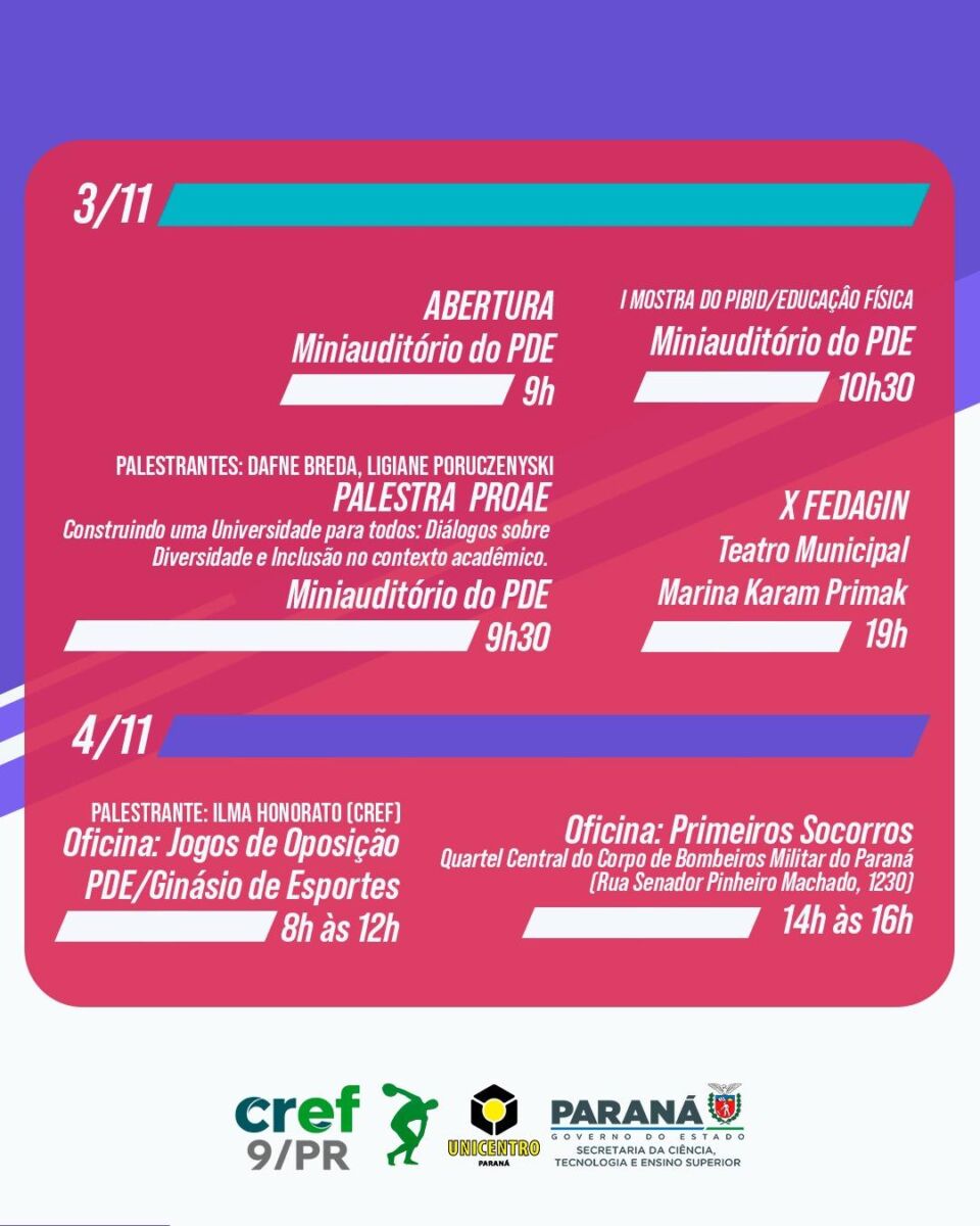 O Departamento de Educação Física da Universidade Estadual do Centro-Oeste (Unicentro) realiza, na próxima semana, a 11ª edição da Semana Acadêmica do curso. A programação reúne temas relacionados à educação, à saúde e ao esporte, com palestras sobre inclusão e oficinas de primeiros socorros. A abertura contará com o 10º Fedagin, o Festival de Dança e Ginástica da Unicentro. As atividades acontecem no miniauditório do PDE e no ginásio de esportes do Câmpus Cedeteg, além do Teatro Municipal Marina Karam Primak.