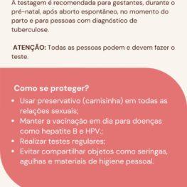 De acordo com o Ministério da Saúde, testes de Infecções Sexualmente Transmissíveis (IST) devem ser realizados com regularidade, garantindo um diagnóstico precoce, tratamento de qualidade e a interrupção da cadeia de transmissão. O serviço de testagem é disponibilizado de forma gratuita pelo Sistema Único de Saúde (SUS) e, em Guarapuava, também pode ser realizado no Serviço de Atendimento Especializado e Centro de Testagem e Aconselhamento (SAE/CTA) ou com o Projeto Ativa.