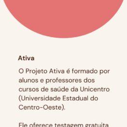 O Ativa é um projeto de extensão formado por alunos e professores dos cursos de saúde da Universidade Estadual do Centro-Oeste (Unicentro) e oferece testagem gratuita para o HIV, Sífilis, Hepatite B e Hepatite C.