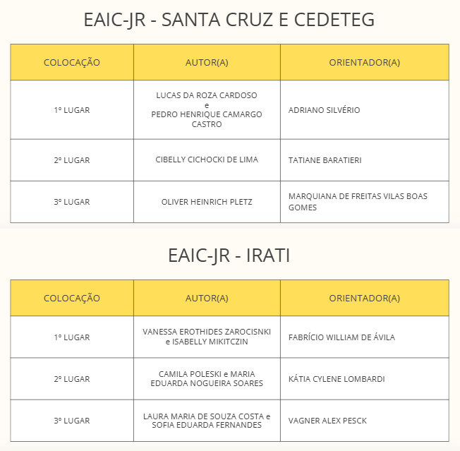 Entre os destaques da edição, está o trabalho das estudantes Vanessa Erothides Zarocinski e Isabelly Mikitczin, do Colégio Florestal de Irati, orientadas pelo professor Fabrício William de Ávila, do curso de Agronomia. Elas conquistaram o primeiro lugar no EAIC-JR de Irati com um projeto sobre o cultivo de erva-mate.