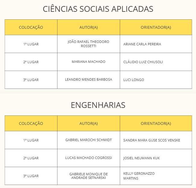 Na área de Engenharias, o segundo lugar ficou com o estudante de Ciência da Computação, Lucas Machado Cogrossi, que desenvolveu um projeto sobre redes neurais artificiais. “Essa menção representa um ano inteiro de estudos extras. É fruto de muito trabalho. Estou muito feliz e já estou inscrito em uma nova iniciação científica, quem sabe até siga carreira acadêmica”, contou o aluno.