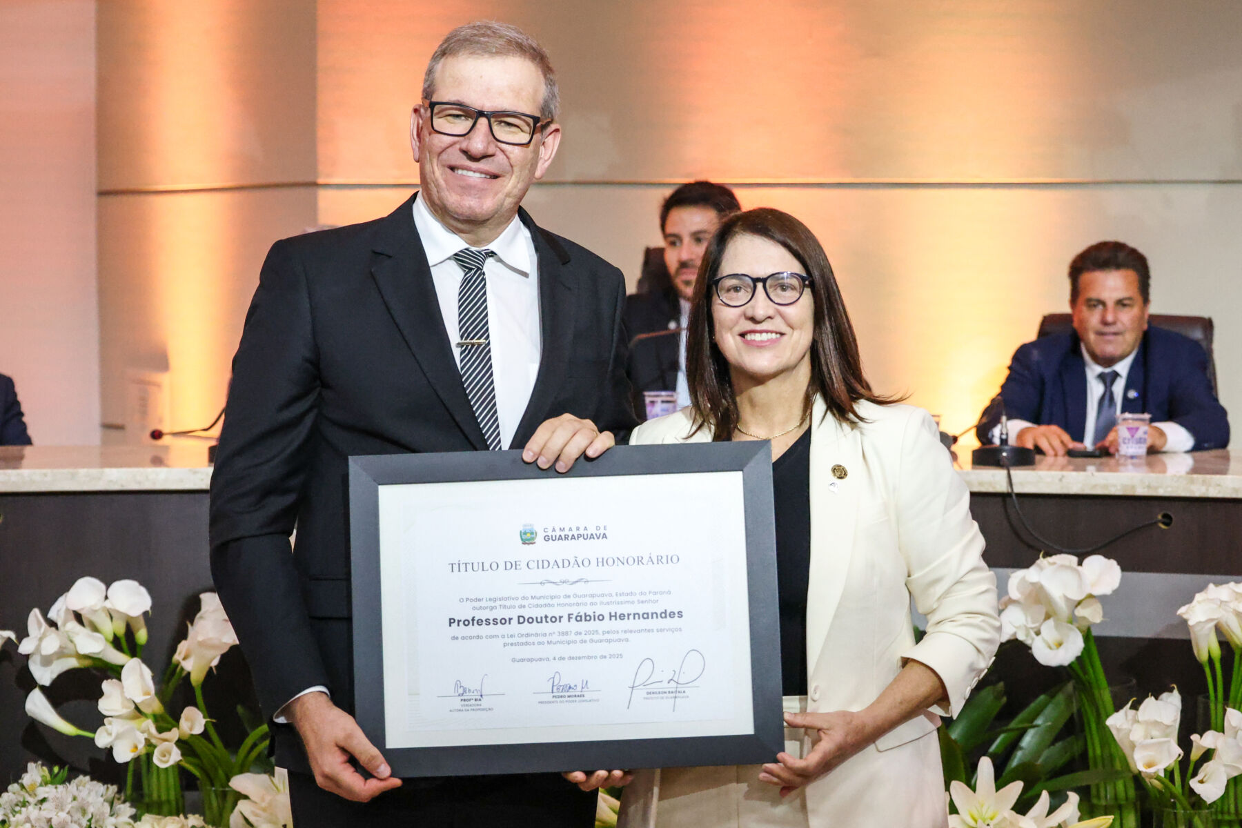A honraria foi proposta pela vereadora Professora Bia e coloca em foco a trajetória acadêmica e administrativa do professor Fábio. Natural de Monte Alto (SP), o docente é graduado pela Universidade Estadual Paulista “Júlio de Mesquita Filho” (Unesp); mestre pela Universidade de São Paulo (USP); e doutor pela Universidade Estadual de Campinas (Unicamp), com estágio na Universidade de Granada, na Espanha. Desde 1999, integra o corpo docente da Unicentro, atuando como diretor do Setor de Ciências Exatas e Tecnologia e do Câmpus Cedeteg. Em 2019, foi eleito reitor e reconduzido em 2024. “O professor Fábio vem fazendo um excelente trabalho dentro da Unicentro. Ele é um cidadão que tem que ser reconhecido pela população de Guarapuava”, ressaltou a professora Bia.