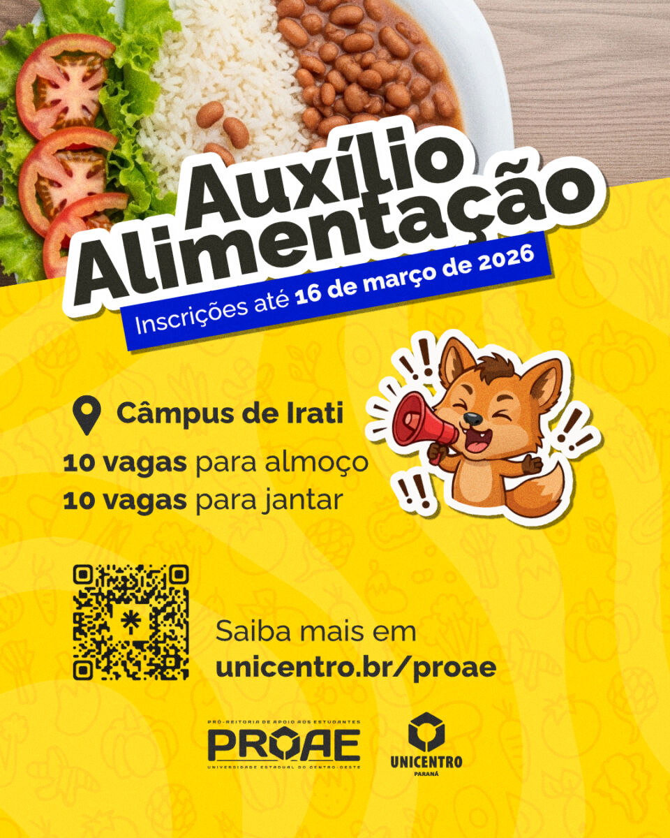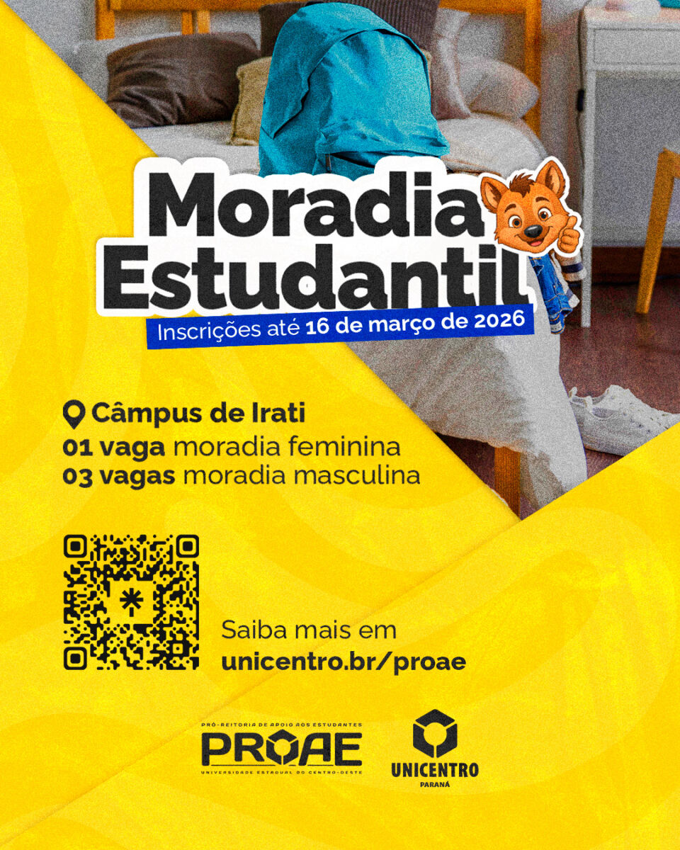As inscrições para Moradia Estudantil e Auxílio Alimentação do Câmpus de Irati seguem até 16 de março de 2026 e devem ser feitas pelo Sistema de Protocolo Eletrônico da Unicentro, anexando os documentos previstos nos editais da Proae.