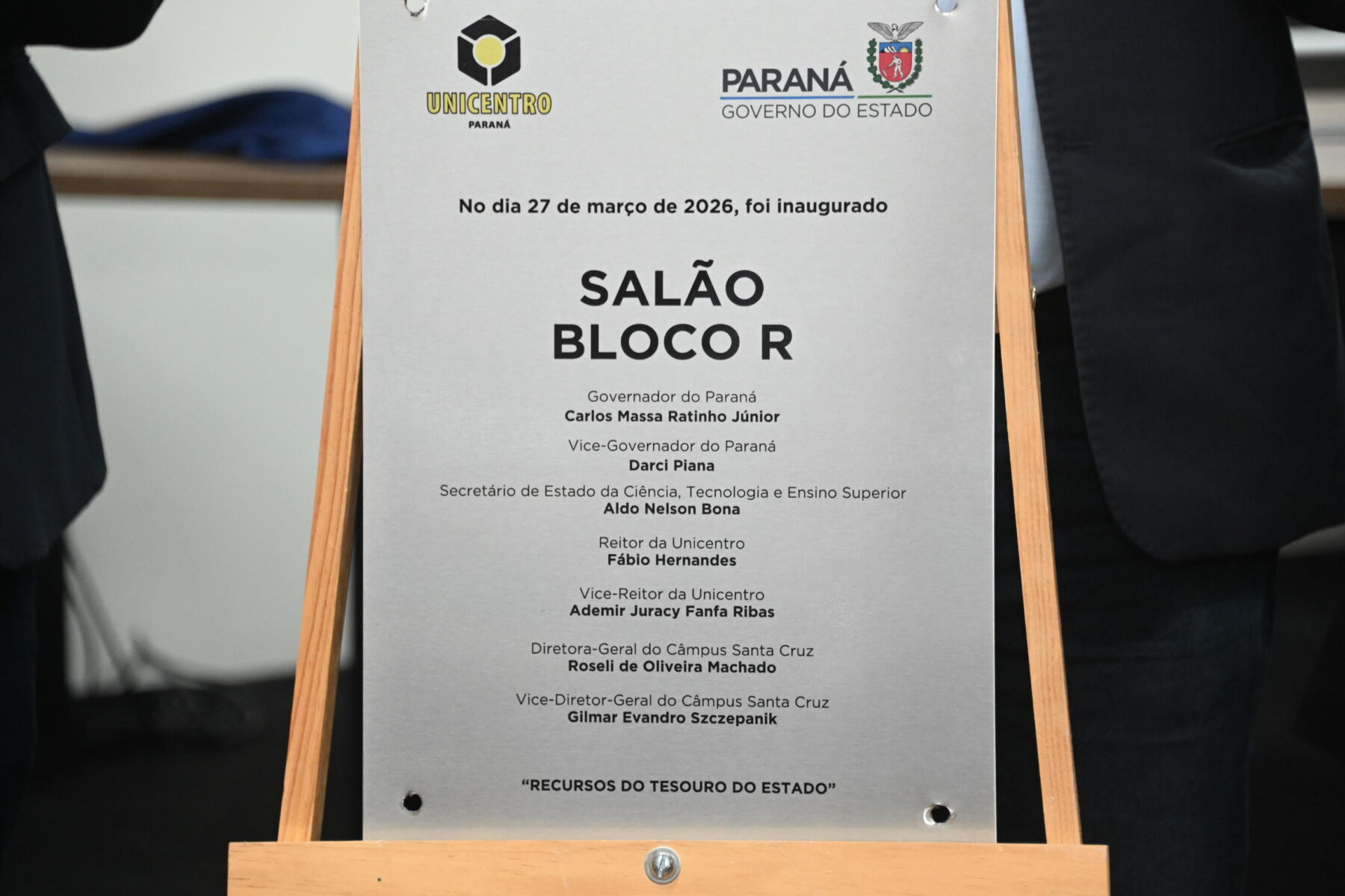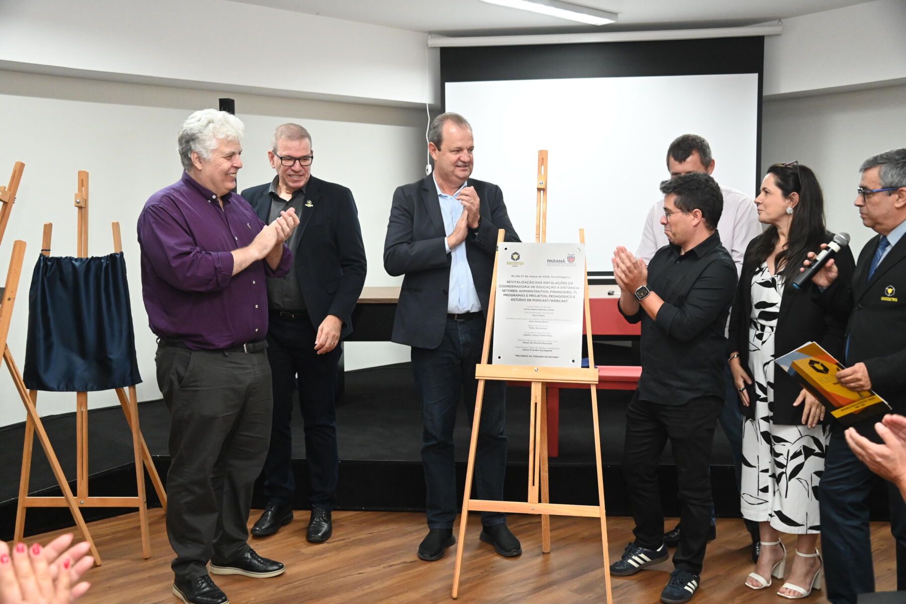 Também fruto do termo de execução descentralizada entre a Seti e a Unicentro, a Sala Conceito do Bloco R teve sua abertura oficial. O espaço, equipado com recursos tecnológicos e destinado ao uso pedagógico, deve atender eventos institucionais de forma provisória. “Ainda no Bloco R, temos a entrega da Sala de Defesas do Câmpus Santa Cruz. A sala é equipada com condições para que as defesas dos nossos programas de pós-graduação possam acontecer em um ambiente próprio e bastante aconchegante para isso”, acrescentou a diretora do Câmpus Santa Cruz, Roseli Machado.