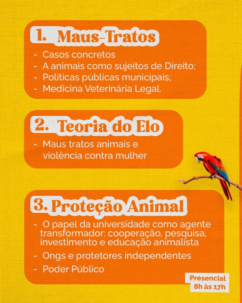 Já o terceiro painel discutirá a proteção ambiental e o papel da universidade como agente transformador, abordando temas como cooperação, pesquisa, investigação, educação animalista e a atuação de ONGs, protetores independentes e do poder público. O painel contará com a participação do policial militar e cinotécnico Fernando França.