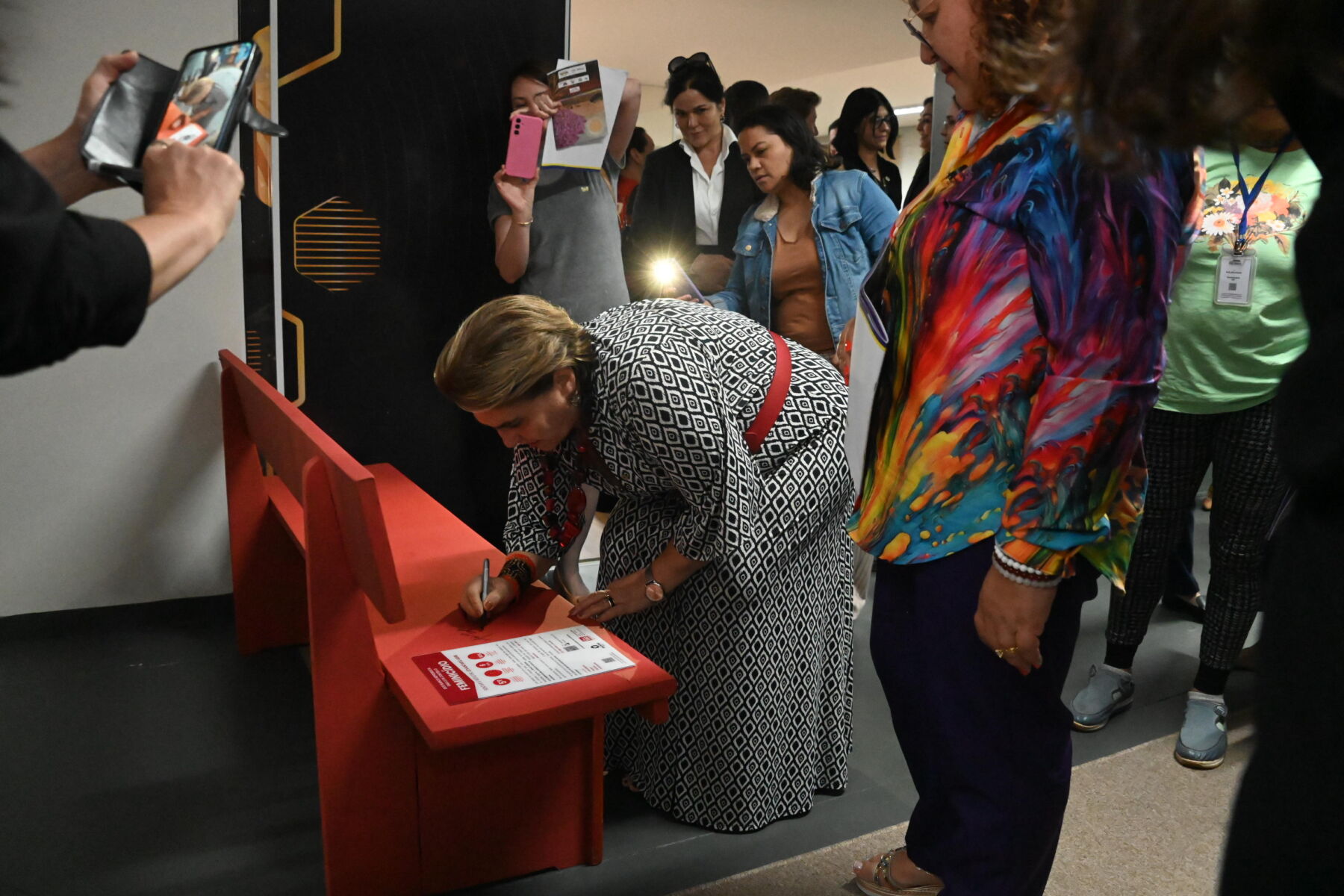 - Ministra aproveitou a visita para assinar o Banco Vermelho, um símbolo internacional de luta contra o feminicídio e a violência doméstica.