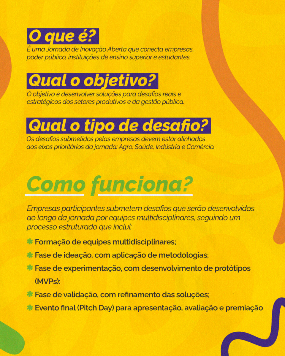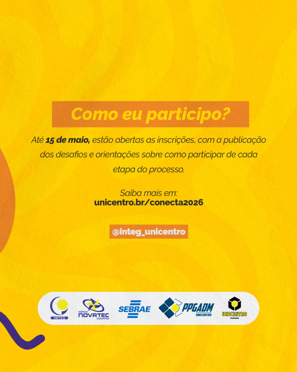 A Universidade Estadual do Centro-Oeste (Unicentro) está com inscrições abertas para o Conecta & Transforma 2026, que será realizado em Guarapuava nos próximos meses. A iniciativa consiste em uma jornada de inovação aberta desenhada para integrar universidades, empresas e setor público no desenvolvimento de respostas para desafios reais. O projeto busca fomentar o empreendedorismo e a transferência de tecnologia na região Centro-Sul do Paraná.