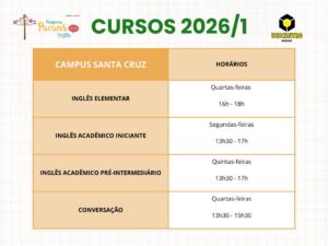 - Os cursos “LEITURA DE TEXTOS ACADÊMICOS”, “INGLÊS ELEMENTAR” e “PREPARATÓRIO PARA PROVAS DE PROFICIÊNCIA EM PÓS-GRADUAÇÃO” NÃO exigem teste de nivelamento prévio.