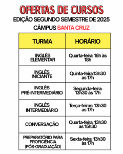 - O curso “Inglês Acadêmico Elementar” NÃO exige teste de nivelamento prévio. Acesse o link para o respectivo formulário abaixo.