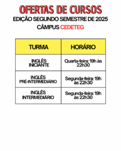 - O curso “Inglês instrumental para iniciantes: estratégias de leitura no contexto acadêmico” NÃO exige teste de nivelamento prévio. Acesse o link para o respectivo formulário abaixo.
