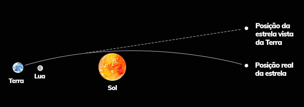 Então, quando tiver a oportunidade e quiser fazer uma análise experimental do fenômeno de um eclipse total do Sol, veja se consegue notar um ponto de luz próximo do círculo do astro. Esta será uma estrela, mas não estará no ponto exato em que você a visualiza.